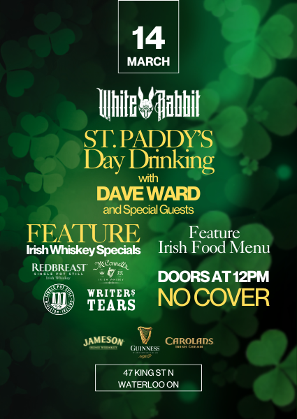 Enjoy a live performance from Dave Ward and Special Guests from 2-5:30PM, a feature Irish menu and feature Irish whiskey! Doors at 12PM, NO COVER.